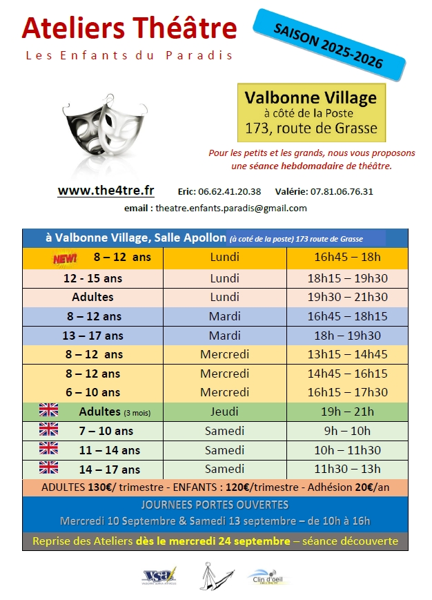 Nous vous proposons des ateliers théâtre hebdomadaires pour les petits et les plus grands, en Français et en Anglais